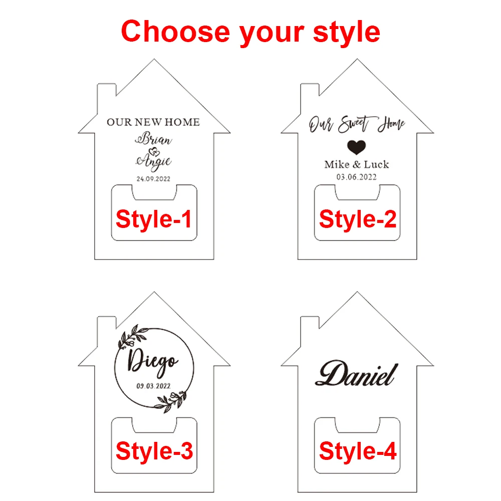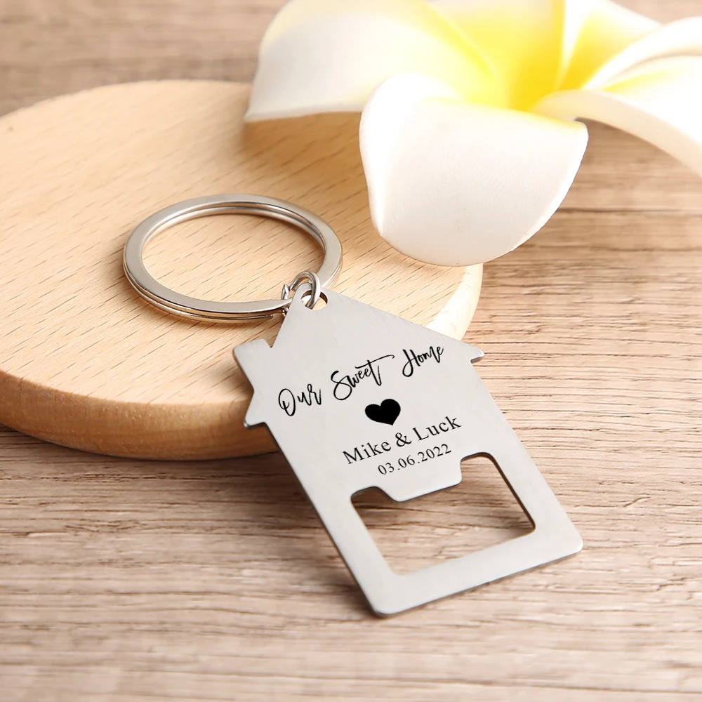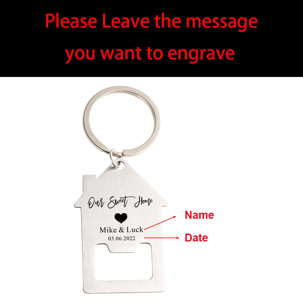Celebrate new beginnings with this personalized house-shaped bottle opener keychain. Made from durable stainless steel, it features customizable engraving for names and a special date, making it the perfect keepsake for couples, new homeowners, or guests. Practical and stylish, this keyring combines functionality with a heartfelt touch, ideal for housewarming parties, weddings, or as a thoughtful gift for loved ones.